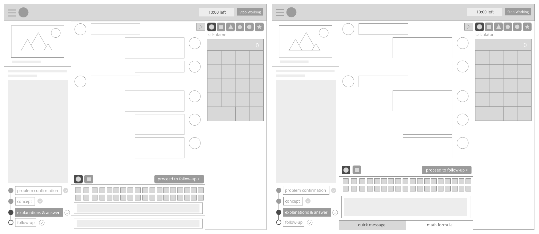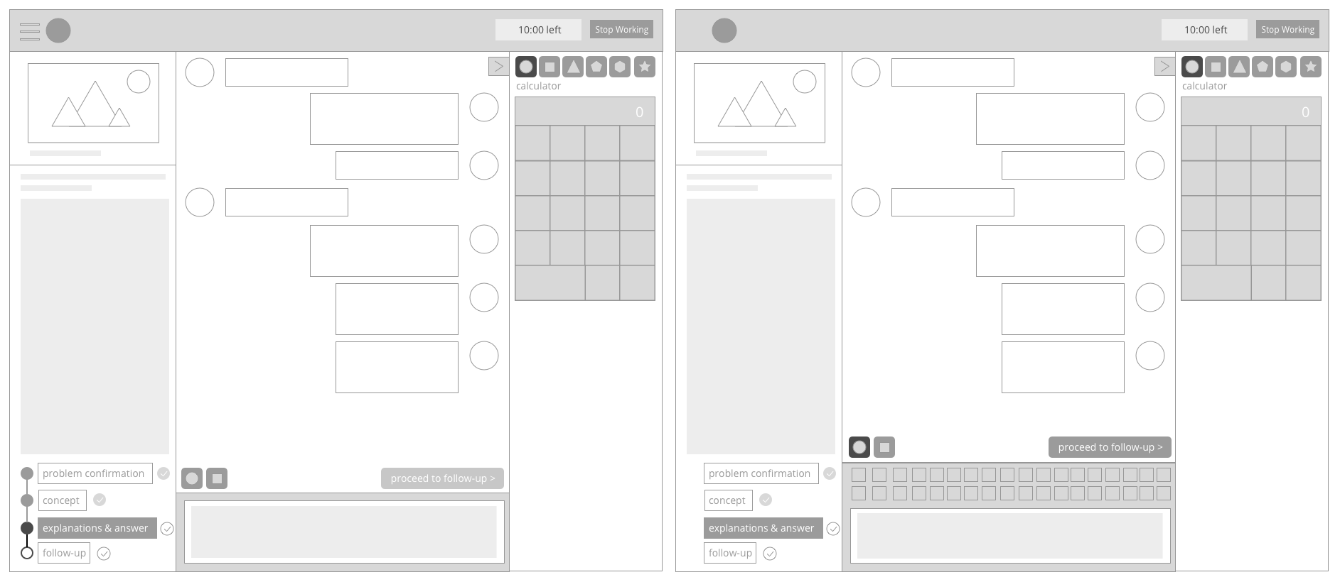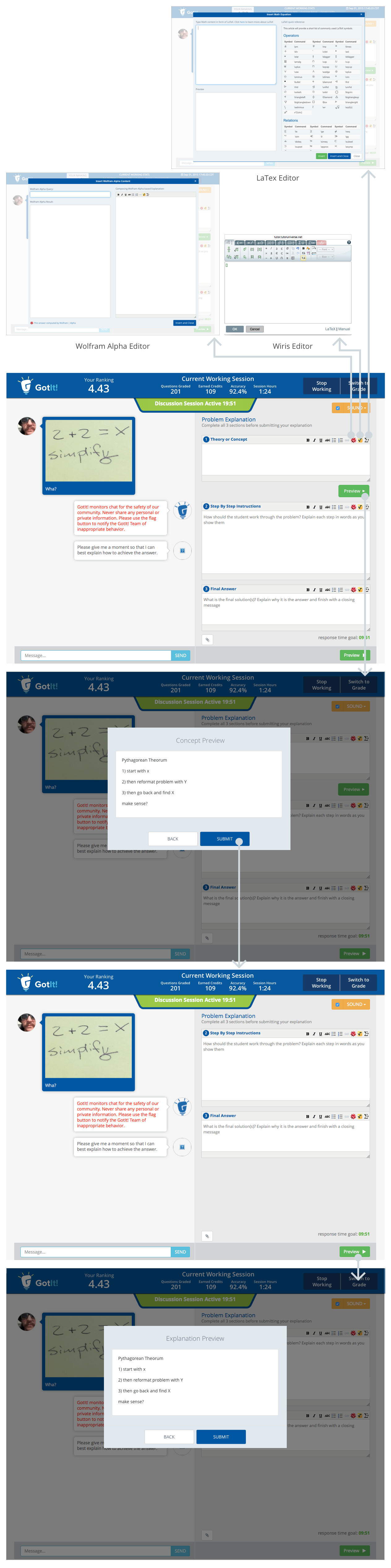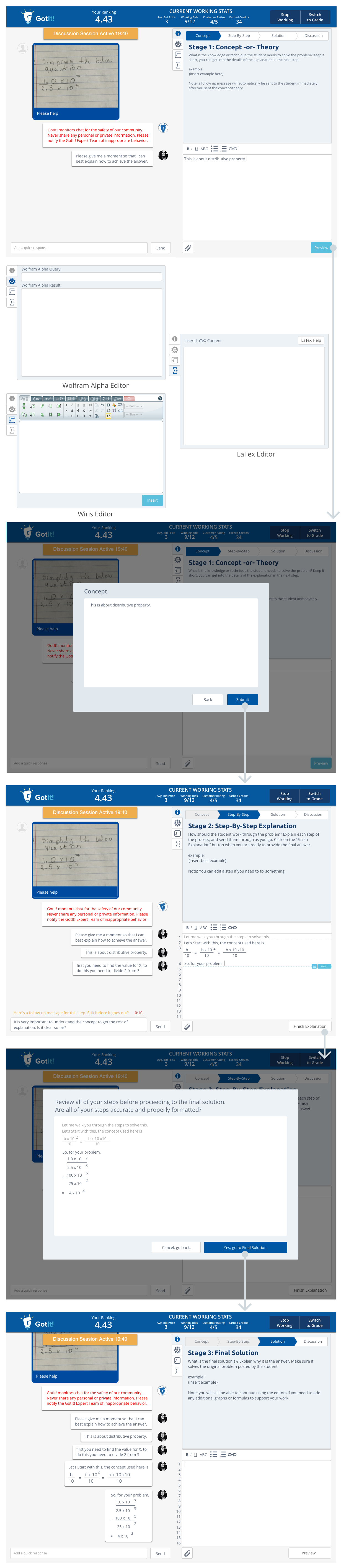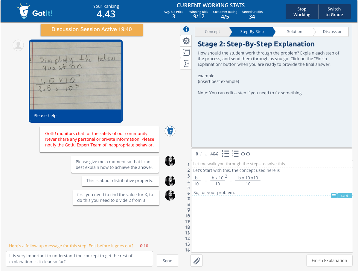 GotIt! Expert portal is an all-in-one web-based product for tutors of high-school math and sciences subjects to find work. They use this product to sign up, pratice problems, bid problems, and guide students through those problems in 1 on 1 sessions. They also use the portal to keep track of past earnings, problem sessions, past performances, and report issues to customer support. The workspace is part of the portal where a tutor connects with a student on one homework problem in a timed chat session.