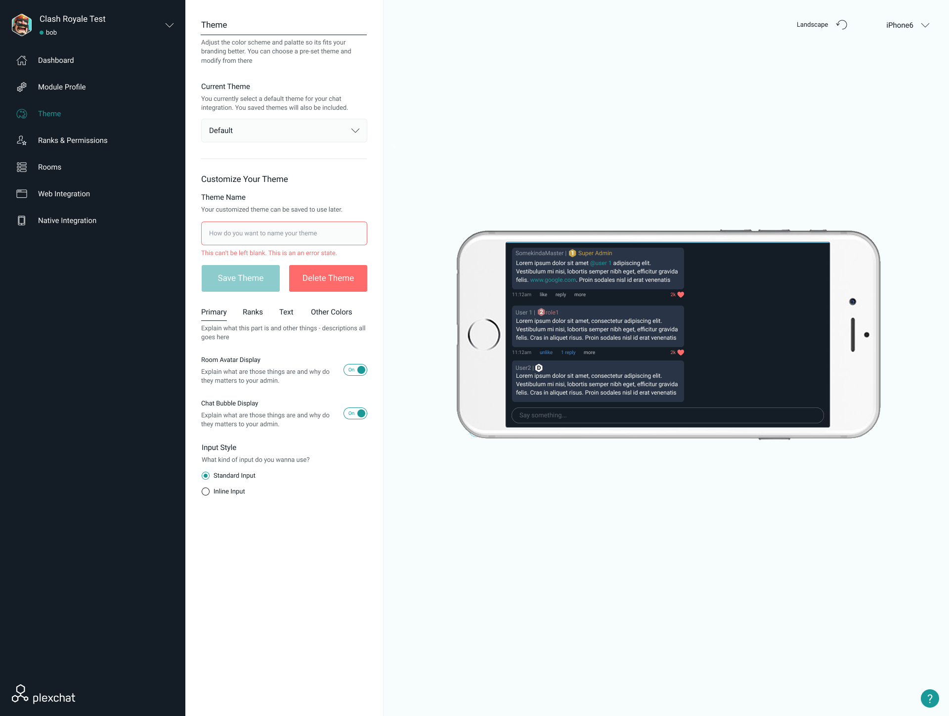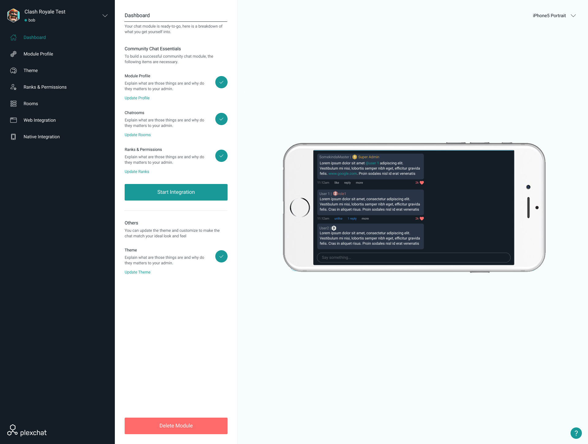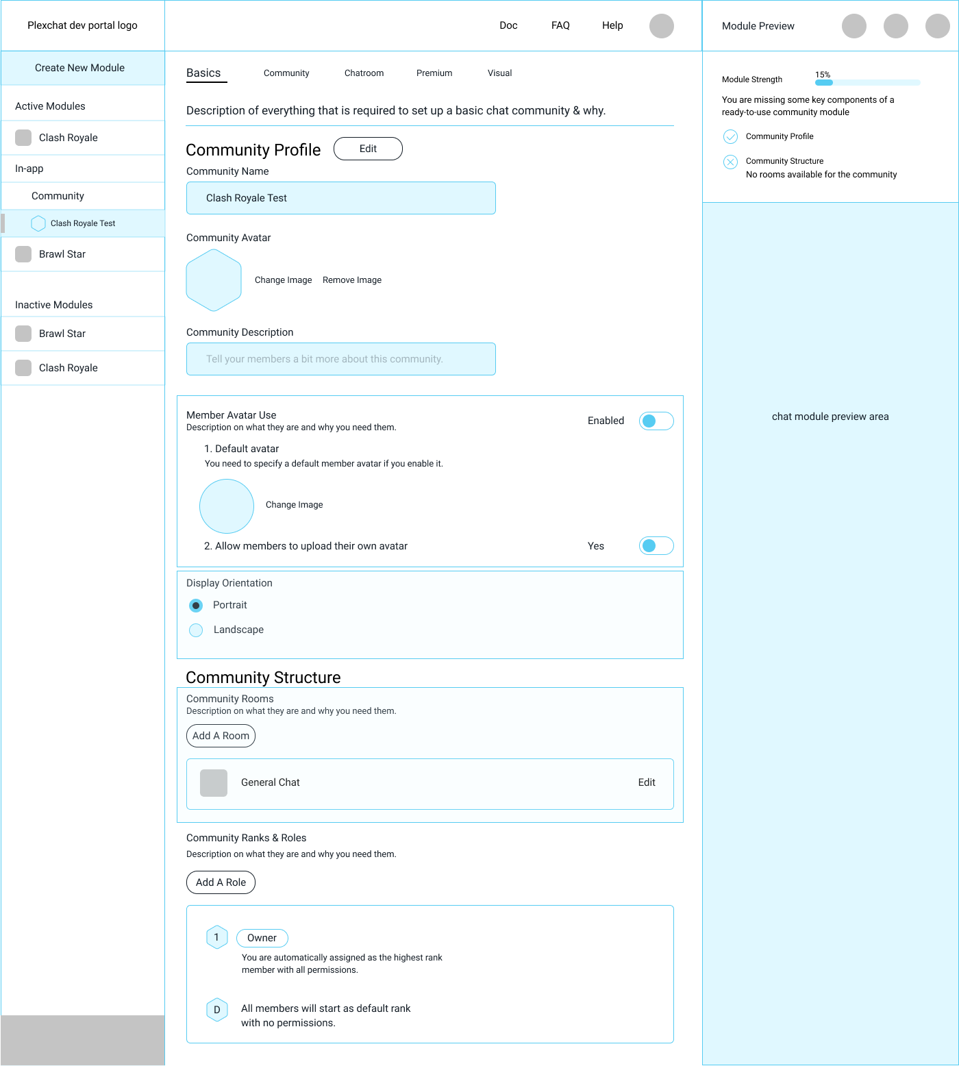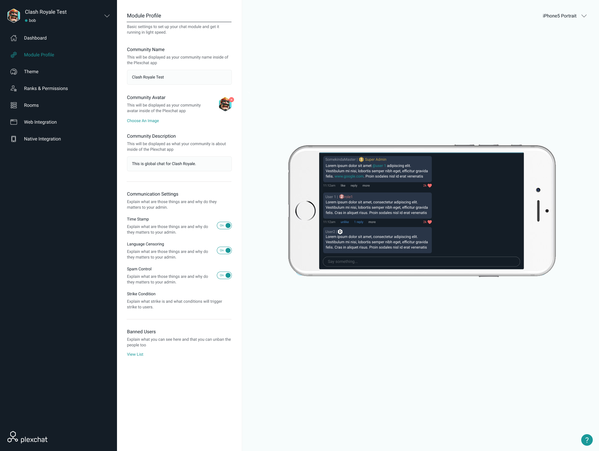 The navigation changed as well in response to the introduction of the organization concept and team permission. The goal was to provide a more clear breakdown of items an administrator role can modify, and more module options for different sizes of communities and use cases, such as 1:1 chat, small group chat, and the default community chat. Moderation and prevention of toxic behavior were the part of core differentiating factors Plexchat web tools provided. To solve a known common pain point from the moderator roles lacking easy access to moderate mobile app communities, we also introduced the option for administrator roles to moderate in-app chat directly in the web portal.